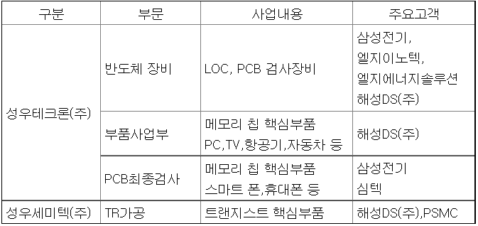 성우테크론 및 종속회사의 영위사업은 반도체 부품 임가공 매출 사업부인 부품사업부, PCB사업부, TR사업부가 있으며 완제품 매출인 장비사업부로 구성되어 있다.