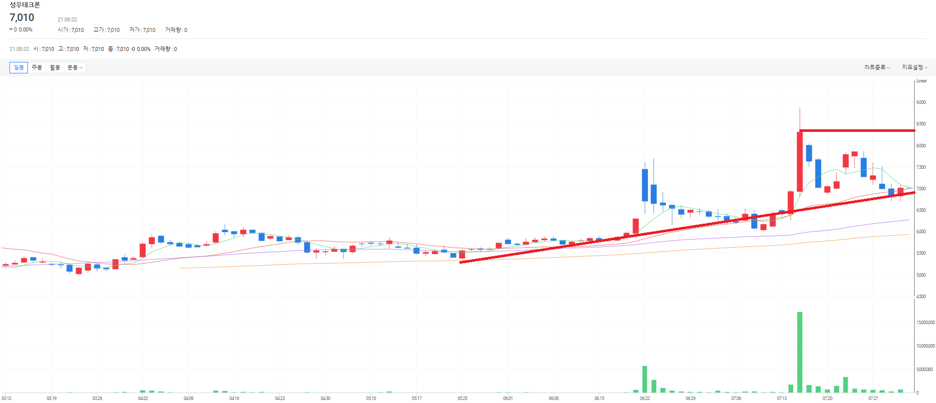 반도체 검사장비의 제조 및 반도체 부품 제조를 주업으로 하고 있는 성우테크론이 갑작스레 시간 외 급등하였다.