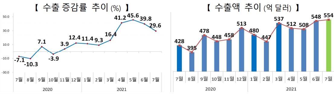 7월 수출은 전년동기대비 +29.6% 증가한 554.4억 달러 기록