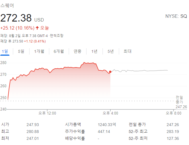 스퀘어(SQ) 주가가 하루 사이에 10% 상승..