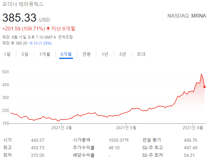 모더나(MRNA) 주가는 지난 12개월 동안 553% 나 급등하며 끊임없이 상승하였다.