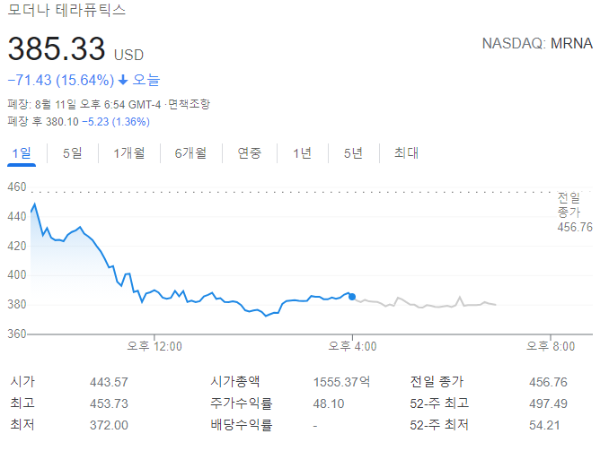 최근 S&P500 편입으로 상승랠리를 펼치던 모더나(MRNA)가 갑작스레 하락하였다.