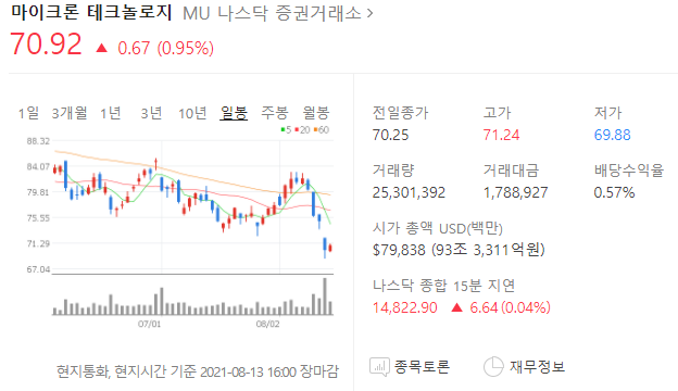 마이크론 테크놀로지(MU) 역시 그 시점부터 주가가 크게 하락하였다.
