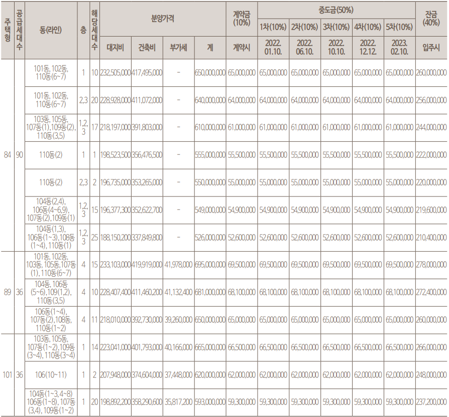 101(36세대) 5억 9,300만 원 ~ 6억 6,500만 원