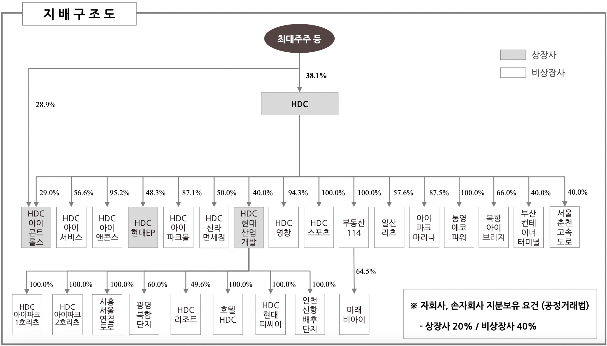 2018년 현대개발산업(주)의 인적분할을 통해 HDC그룹의 지주사로 전환하여 35개의 계열회사를 보유하고 있음.