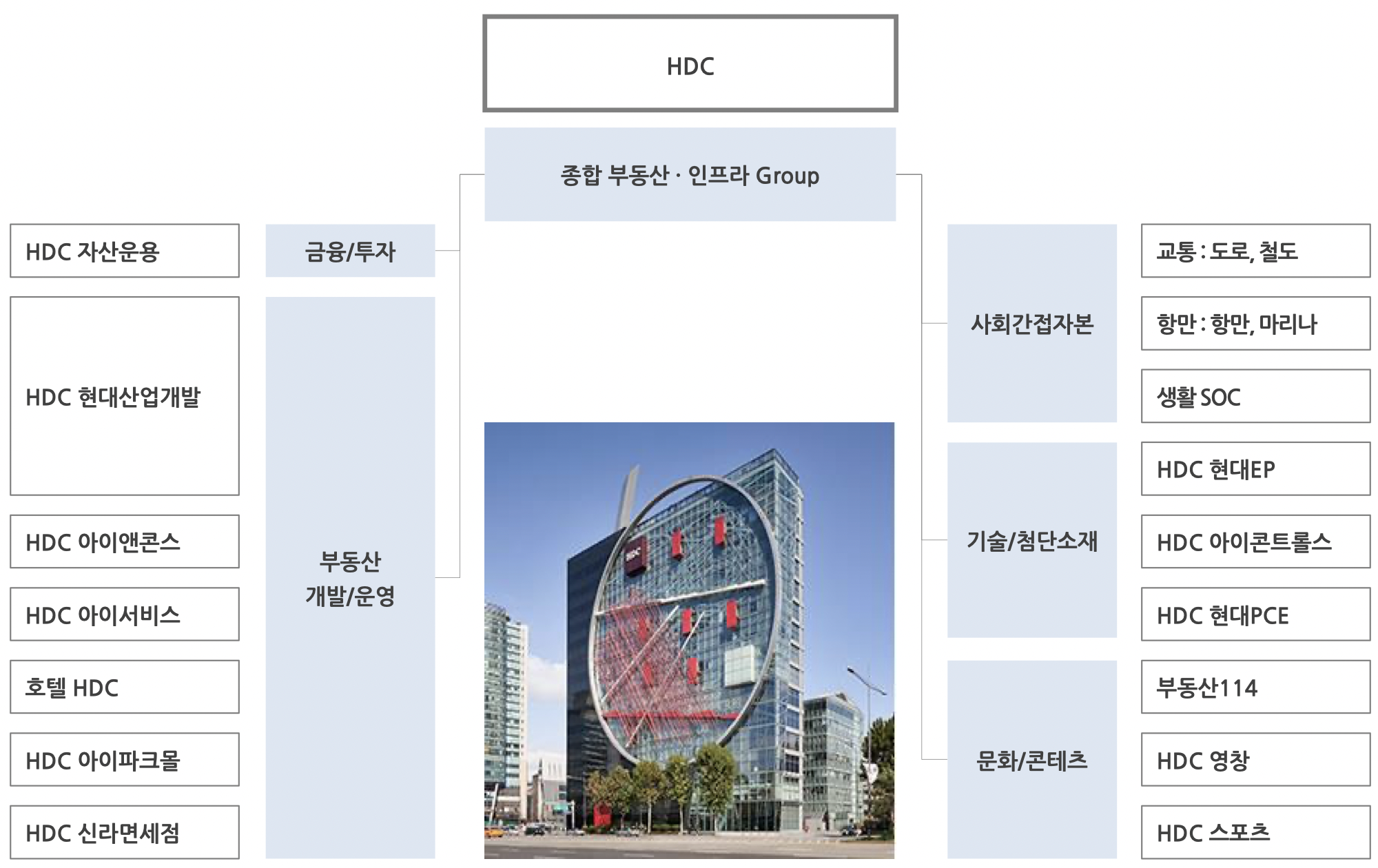 HDC그룹의 지주회사로서 창사 이래 이어져온 디벨로퍼 DNA를 바탕으로 독창적 가치를 창조, 종합부동산업, 자산관리, 첨단신소재, IT, 유통, 호텔, 리조트, 문화, 스포츠 등 다양한 영역의 사업자 회사를 보유함.