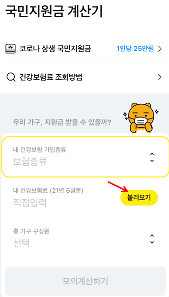 이제 내 건강보험 가입 종류랑 총 가구 구성원을 선택하시고 모의 계산하기를 누르시면