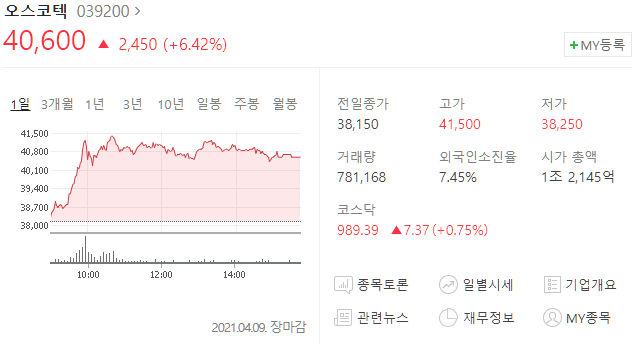 오스코텍(039200) 주가 40,600원(+6.42%)