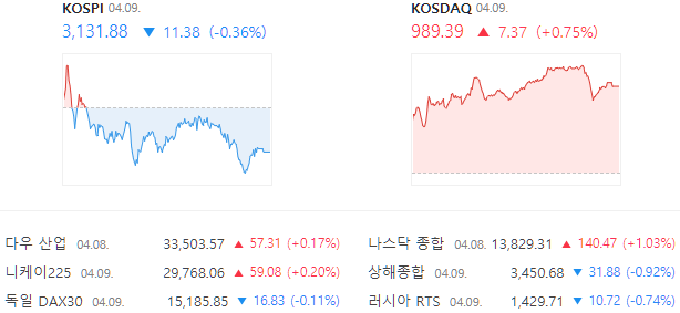 KOSPI 3,131.88(-0.36%)
