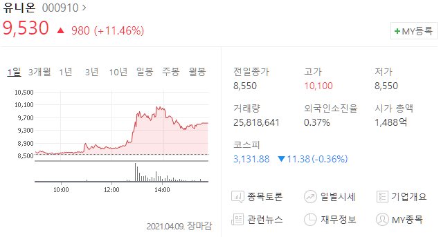 유니온(000910) 주가 9,530원(+11.46%)