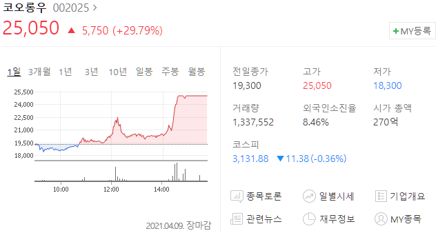 코오롱우(002025) 주가 25,050원(+29.79%)