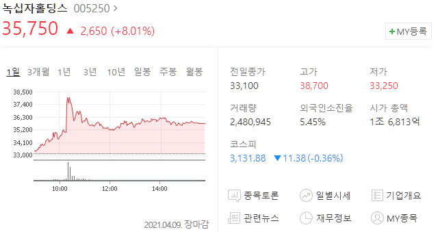 녹십자홀딩스(005250) 주가 35,750원(+8.01%)