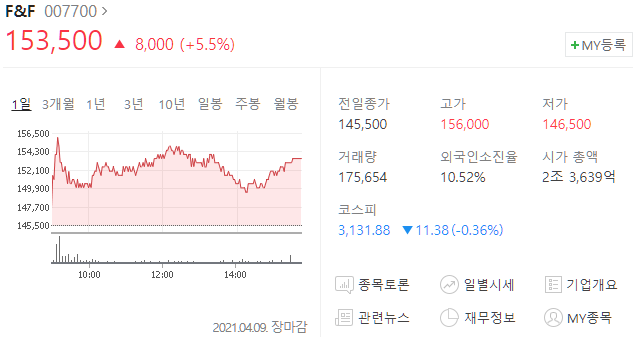 F&F(007700) 주가 153,500원(+5.5%)