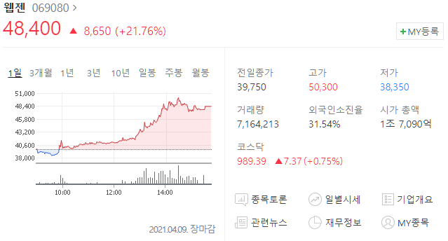 웹젠(069080) 주가 48,400원(+21.76%)
