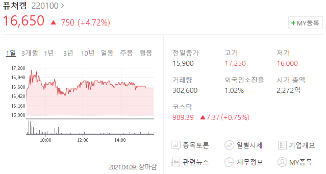 퓨쳐켐(220100) 주가 16,650원(+4.72%)
