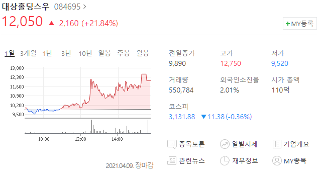 대상홀딩스우(084695) 주가 12,050원(+21.84%)