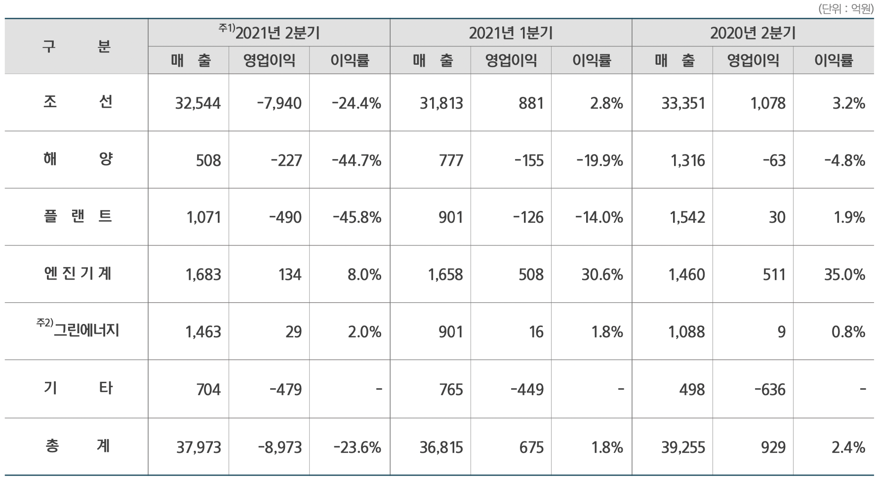 - 해양부문 매출 감소에도 불구하고 특수선을 포함한 조선부문 건조물량 증가로 전분기 대비 매출 증가