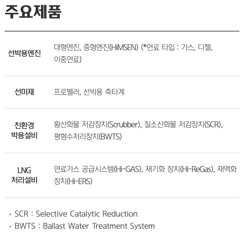 또한 선박용 탈황설비(스크러버), 질소저감장치, 평형수처리장치 등의 친환경 설비뿐만 아니라, LNG선의 핵심 처리설비인 가스연료공급시스템, 가스재기화/재액화 장치 및 프로펠러 등 핵심 기자재를 일괄 생산하여 국내·외 조선소에 공급하고 있다.