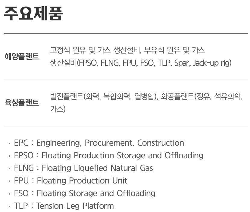 해양 유전과 가스전을 개발/생산하는 다양한 형태의 해양플랜트 공사를 설계, 구매, 제작, 운송, 설치 및 시운전까지 턴키(Turnkey) 방식으로 일괄 수행하고 있으며, 전 세계 30여 개 이상의 고객사에게 170 여기의 해양플랜트를 성공적으로 인도하였다.