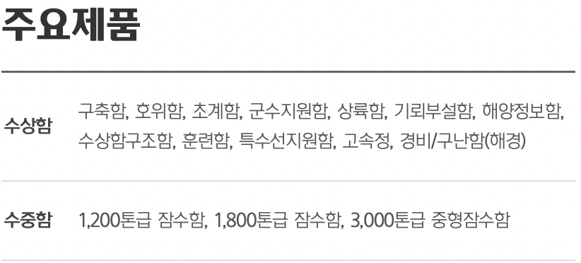 1975년 한국 최초의 국산 전투함인 울산함 개발을 시작으로 최첨단의 이지스 구축함과 차세대 한국형 잠수함에 이르는 여러 종류의 최신예 함정을 자체 개발하여 대한민국 해군과 해양경찰에 공급하였으며, 우리나라 조함자립의 선구자적인 역할을 수행해 왔다.