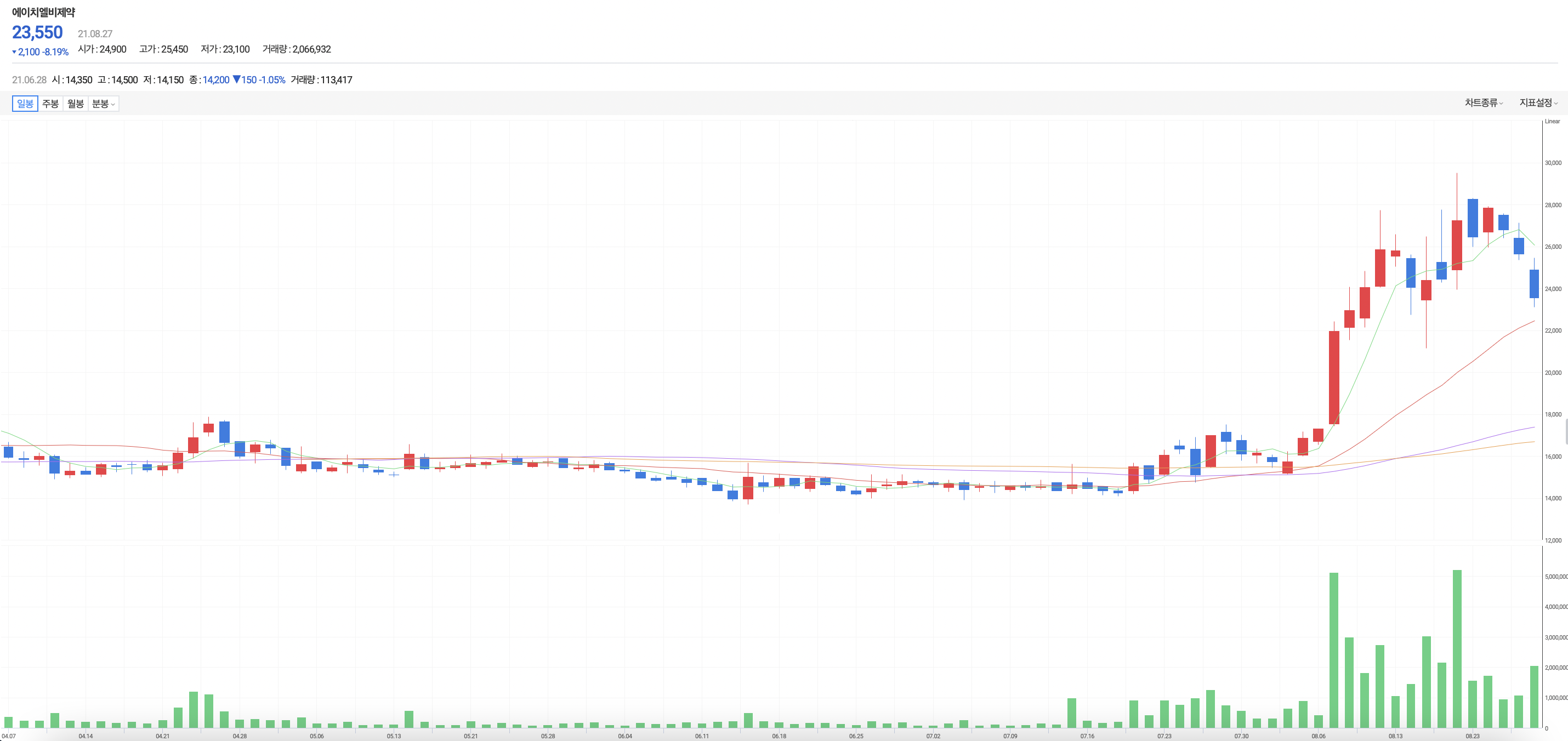 27일 시간외 매매에서 에이치엘비제약이 주가 급등 종목에 이름을 올렸다. 이날 오후 6시 기준 에이치엘비제약 주가는 종가보다 6.16% 오른 2만5000원에 시간외 거래를 마쳤다.에이치엘비제약의 시