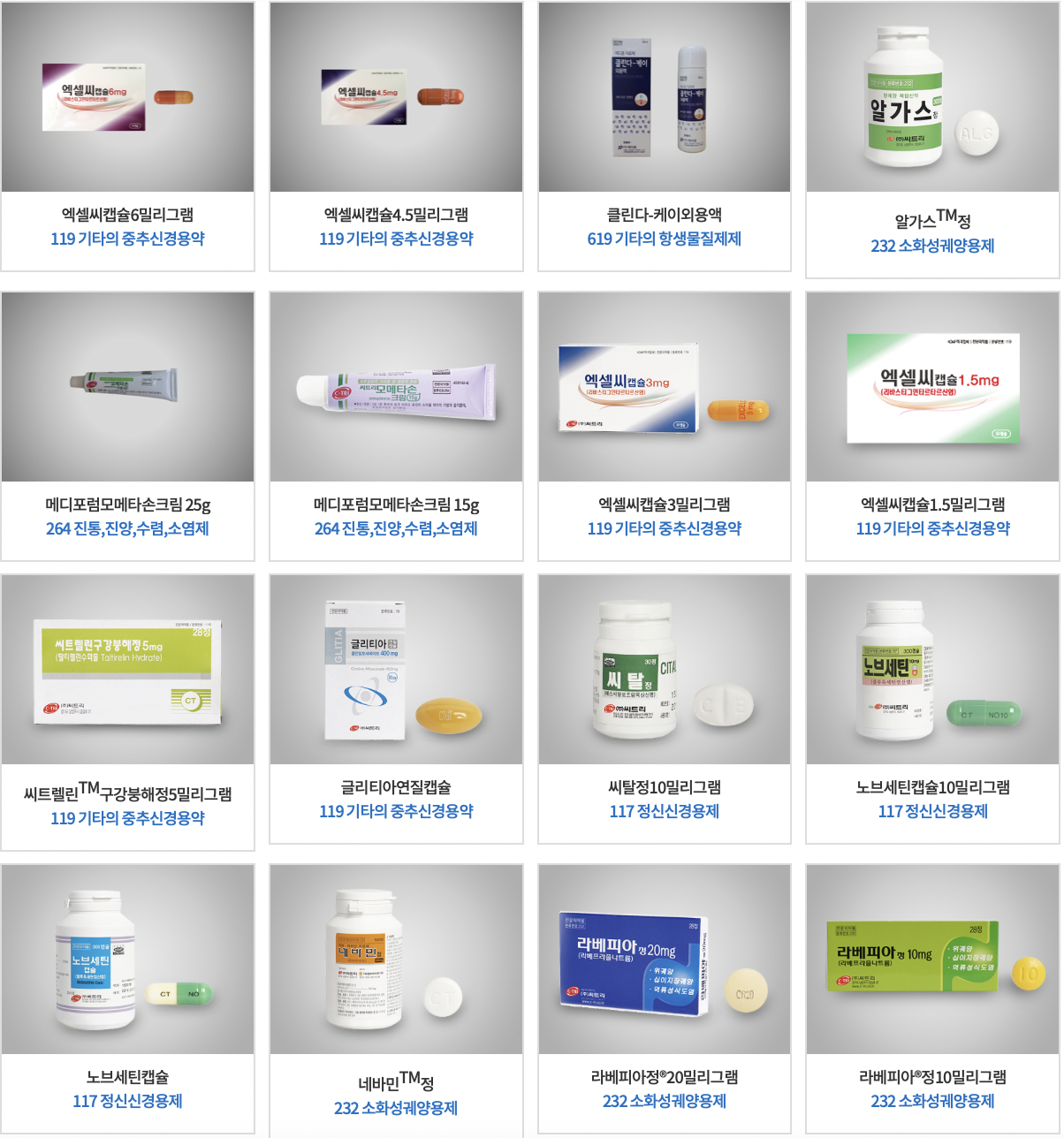 - 2015년 12월 21일 코스닥 시장에 상장하였으며 현재 주요 제품은 의사의 처방에 의한 전문의약품 ETC에 속하는 '씨트리시메티딘정', 로자틴정', '라베피아정' 등과 일반의약품 OTC에 속하는 '지노베타딘질좌제'등이 있다.