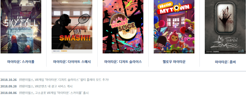 또한 신사업인 VR사업에서는 관계사인 (주)원이멀스에서 개발한 "KART Chaser", "Preta:Vendetta Rising", "Casinopia:The Blackjack". 오크지옥, 인페르노:데스필드". "디저트 슬라이스, "다이어트 스매시" 스튜디오에이치와 공동 개발한 "Smashing the Battle VR" 및 오버턴을 서비스 중이다. 뿐만 아니라 VR 게임 개발사인 일리언 및 VR 테마파크 전문 기업인 홍빈 네트워크에도 지분투자를 당행 하며 경쟁력을 확보하고 있다.