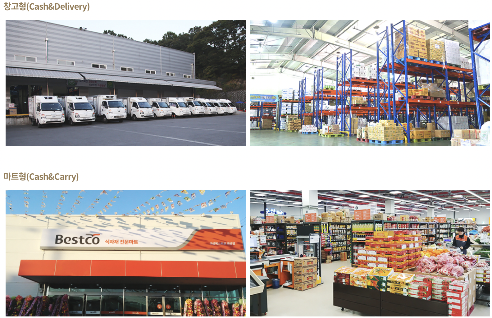 Cold Chain을 통한 안전하고 신선한 식자재를 외식업소에서 직접 받아 볼 수 있는 배송형 사업장과 외식사업에 필요한 모든 상품을 원스톱 구매할 수 있는 마트형 사업장을 전국에 20개 운영하고 있어, 쉽고 편리하게 상품을 공급받을 수 있는 서비스를 제공하고 있다.