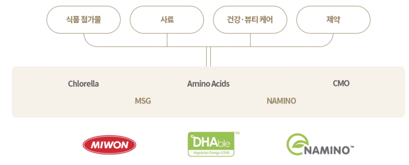 대상은 1960년 이후 축적된 바이오 기술을 바탕으로 조미소재, 아미노산류, 그리고 미세조류 배양기술을 통한 클로렐라 등 다양한 제품을 생산해오고 있으며, 지속적인 제품 Line-up을 통해 사업영역을 확대하고 있다.