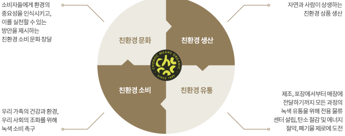 1999년 설립된(주)초록마을은 전국 420여 개 매장과 온라인 쇼핑몰 모바일 앱을 통해 1,500여 종 이상의 상품을 판매하고 있는 친환경 유기농 NO.1 브랜드 이다. 체계적인 식품안전관리시스템과 물류시스템을 통해 초록마을 매장의 전국 운영을 실현하였고, 당일 배송 서비스인 초록배송으로 고객에게 편리한 쇼핑환경을 제공하고 있다. 일부 한정된 채널에서만 구입해야 했던 친환경 식품을 내 집 앞에서 편리하게 구매할 수 있는 여건을 조성하며 삶의 질 향상과 더불어 '건강과 지속 성장성을 추구하는 라이프스타일(LOHAS;Lifestyle of Health and Sustainability)'확산에 기여하고 있다.