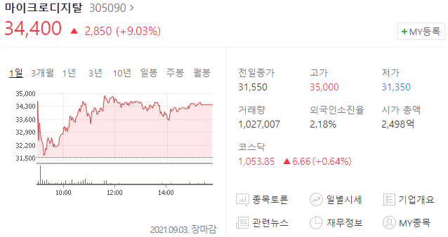 마이크로디지탈이 일회용 세포배양 시스템(셀빅)과 신종 코로나바이러스 감염증(코로나19) 항체 진단키트의 매출 본격화가 기대된다는 증권가 전망이 나오면서 급등세다.3일 오후 1시43분 마이