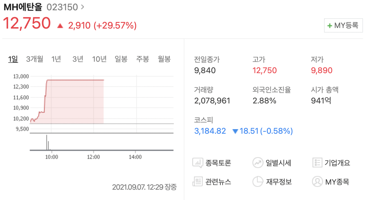 MH에탄올 - MH에탄올은 주정의 제조 및 판매를 하는 주정 사업부, 기계설비 및 제작 사업부, 골프장 사업부를 운영하는 회사로 홍준표 의원이 경남도지사 시절 중점 사업으로 추진한 진해 웅동 복합리조트 사업으로 인해 홍준표 관련주로 분류되었다고 한다.