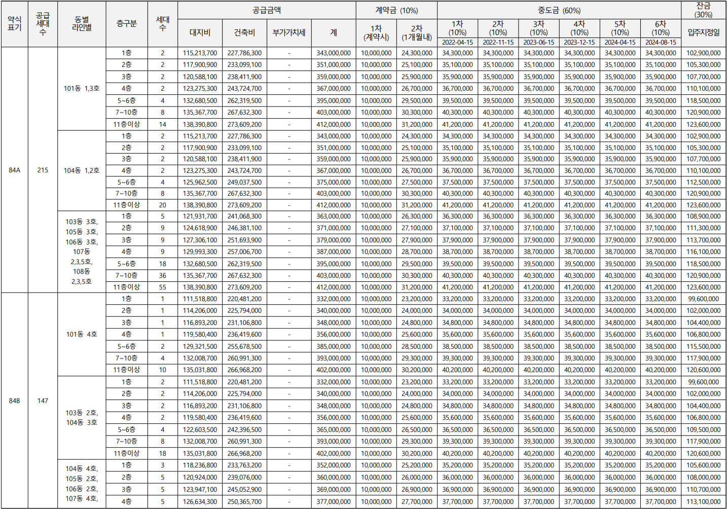 84㎡A(215세대) 3억 4300만 원 ~ 4억 1200만 원