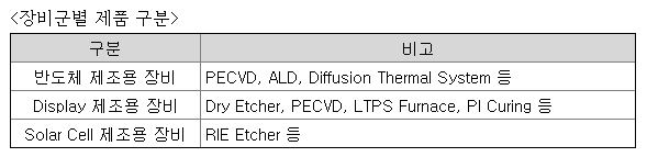 당사는 반도체, Display 및 Solar Cell 제조용 장비를 생산, 판매하고 있습니다. 당사의 경우, 한정된 사업장 내에서 동일한 설비와 인력을 활용하여 제품을 생산하기때문에 사업 부문의 구분이 현실적으로 어려워 단일 사업 부문으로 작성을 하되, 생산되는 장비의 특성 및 고객사가 속한 산업군 등을 고려하여 총 3개의 장비군으로 나누어 현황을 기재 하였습니다.