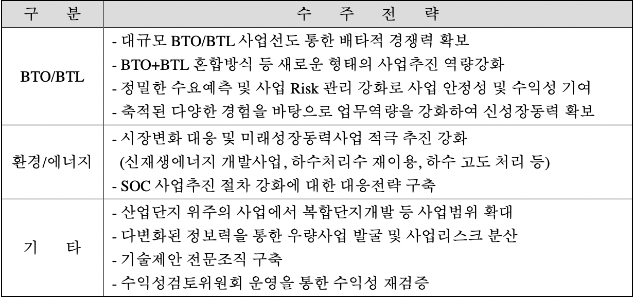 고부가가치 창출이나 안정적인 수익 발생이 가능한 공종을 추가로 발굴하고, 사업 다각화를 통해 다양한 미래 먹거리를 확보 노력중.
