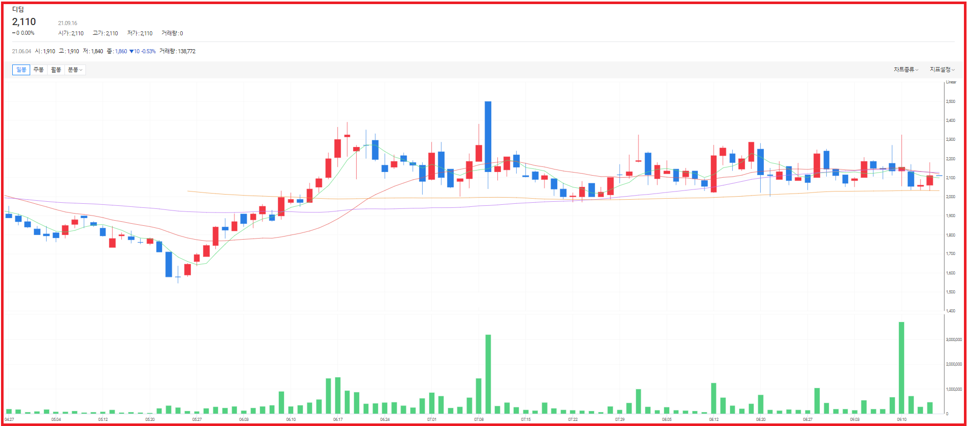 이제 막 달리기 시작한 디딤 주가라 몇 차례 더 상승할 수는 있겠지만 실적이랑 관련 없이 급등한 주식의 전망이 밝다고 생각하진 않는다.