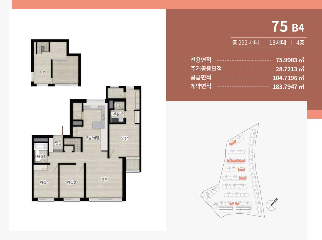 총 292세대의 도시형생활주택으로 꼭대기 층(74B4, 84A4)를 제외한 모든 세대에 테라스가 달려있는 것이 특징이네요.