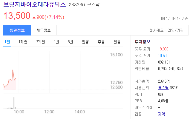브릿지바이오테라퓨틱스의 주가가 갑작스레 급등하고있다. 무슨이유로?