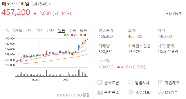 에코프로비엠 주가가 7일부터 시작해 8일째 상승중이다. 상승률은 대략 46%...
