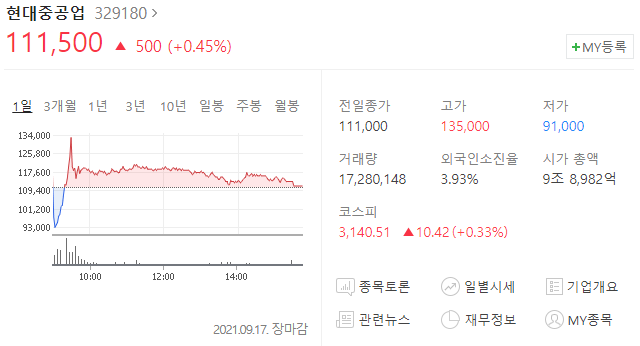 현대중공업 주가 111,500원(+0.45%)