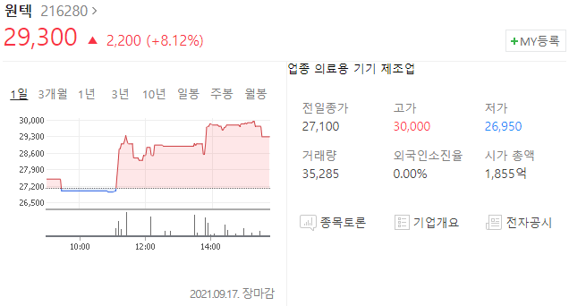 원텍 주가 29,300원(+8.12%)