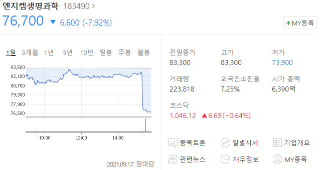 엔지켐생명과학 주가 76,700원(-7.92%)