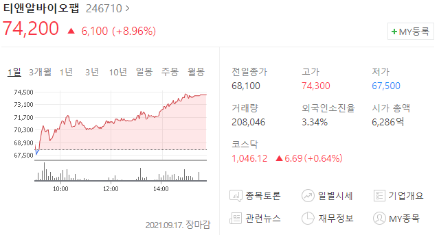 티앤알바이오팹 주가 74,200원(+8.96%)