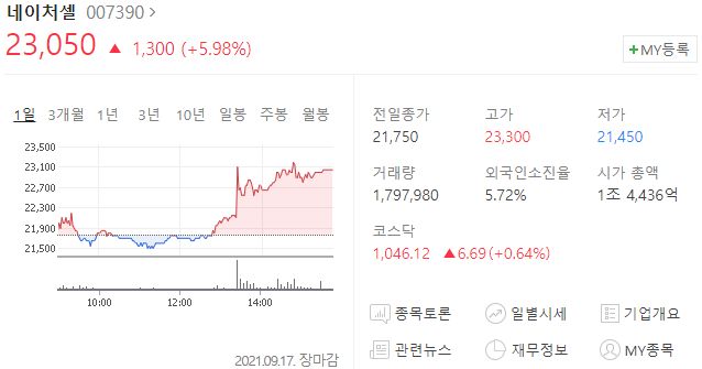 네이처셀 주가 23,050원(+5.98%)