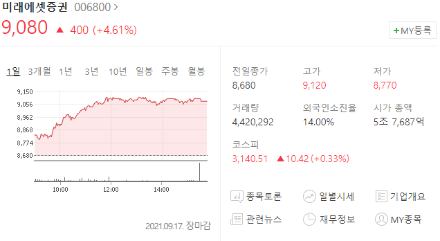 미래에셋증권 주가 9,080원(+4.61%)