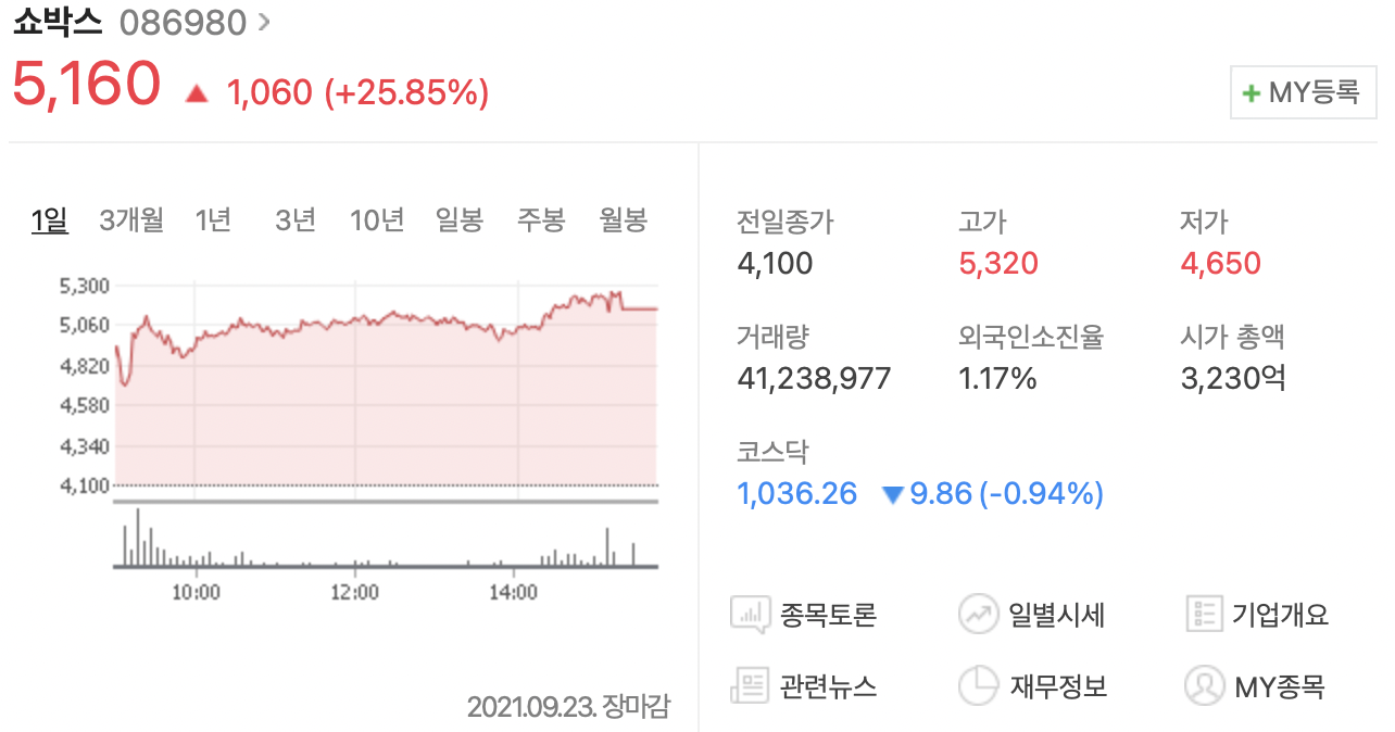 넷플릭스 오리지널 콘텐츠 '오징어게임'의 흥행에 힘입어 제작사에 투자한 쇼박스가 급등세다.23일 오전 10시18분 기준 쇼박스는 전 거래일 대비 930원(22.68%) 오른 5030원에 거래되고 있다.쇼박스는