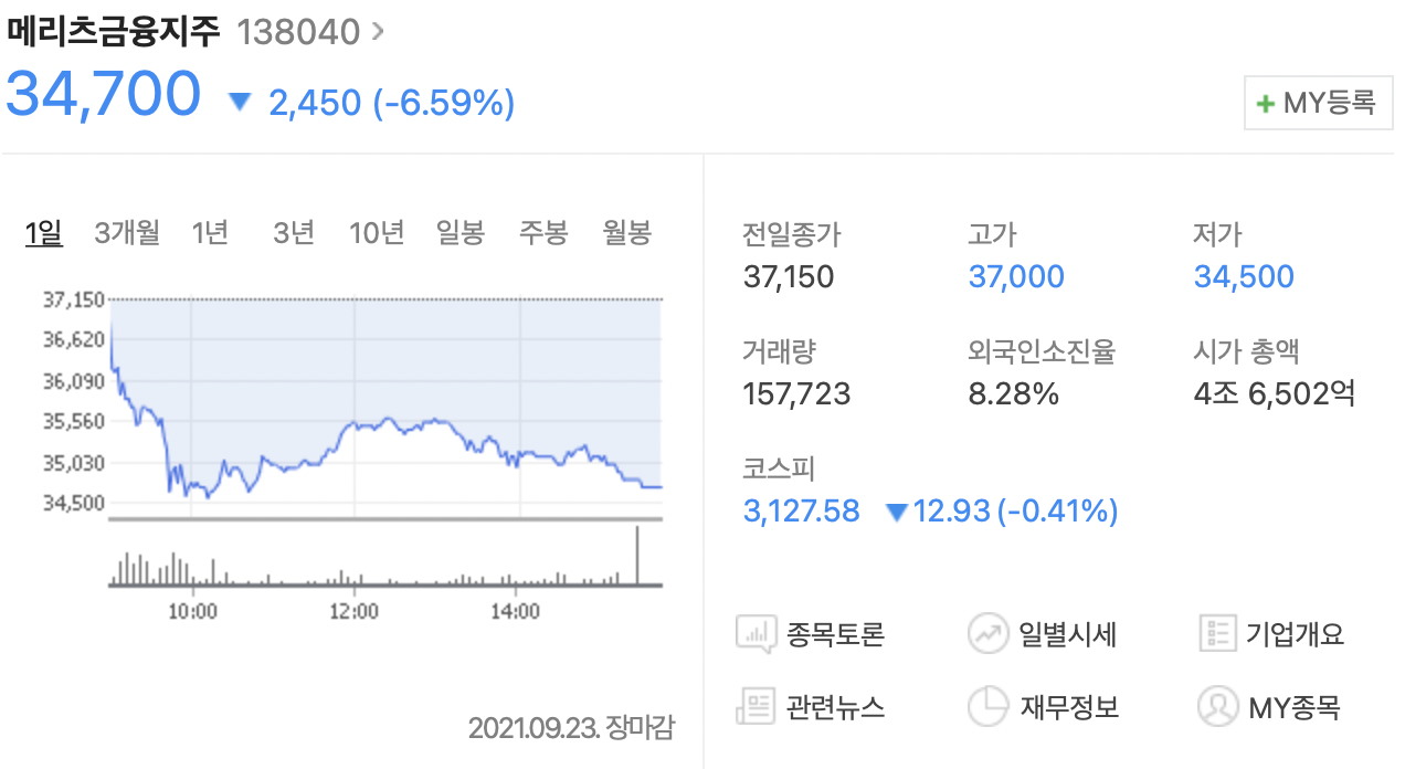 中 '헝다 쇼크'에 금융주 약세…메리츠금융지주 6%↓ [특징주]
