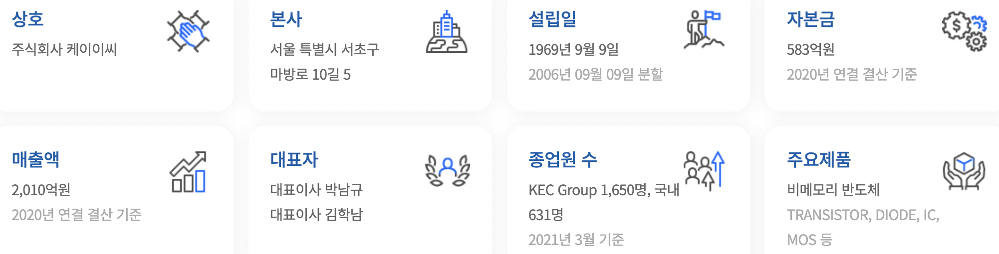 KEC는 1969년 한국전자홀딩스로 설립되어 한국의 전자 산업과 역사를 같이해 온 반도체 전문 기업이다. 비메모리 전력 반도체를 중심으로 오랜 기간 국내 굴지의 가전, 자동차 제조 기업과 협력하고 있으며 중국, 일본, 미국으로 수출 비중을 높이며 글로벌 기업으로 도약하고 있다. 현재 12개의 현지법인 및 해외 영업망을 통해 제품을 공급하고 있고 글로벌 대형 유통사와의 파트너십을 통해 글로벌 네트워크를 확장하고 있으며 꾸준한 연구개발로 핵심기술확보와 기술혁신을 추구하며 국내 전력반도체 국산화에 앞장서고 있다. 국내 전력 반도체 중견기업으로서는 유일하게 자체 생산시설을 보유한 기업으로 기술경쟁력과 제조 경쟁력까지 모두 갖추며, 기술 개발과 제품의 품질 향상에 매진하고 있다.