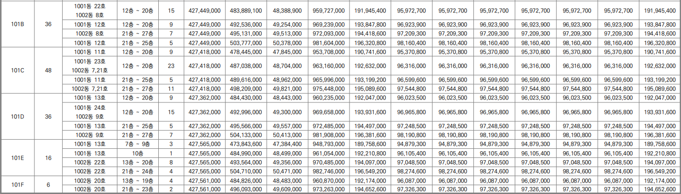 101㎡B 9억 5973만 원 ~ 9억 8160만 원