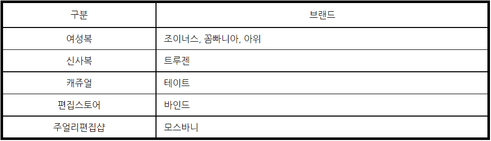 여성복 브랜드 조이너스, 꼼빠니아, 신사복 브랜드 트루젠, 캐주얼 브랜드 데이트, 편집 스토어 바인드, 패션 주얼리 브랜드 모스바니 등을 보유하고 있다.